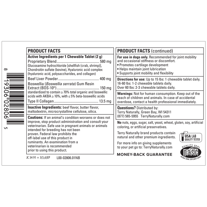 Terry Naturally Active Mobility provides advanced joint, cartilage, and connective tissue support for dogs of all sizes. Each chewable tablet blends glucosamine, chondroitin, type II collagen, hyaluronic acid, and BOS-10® boswellia to promote comfort, flexibility, and active movement. This synergistic formula helps maintain joint lubrication and resilience for playful, energetic dogs at any age.