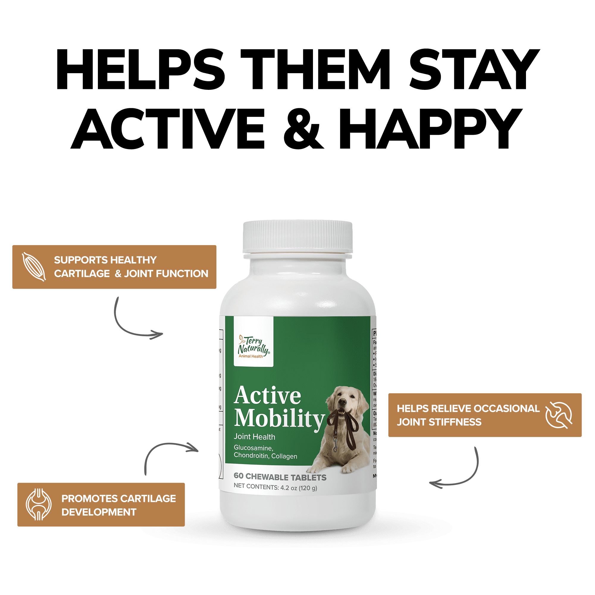 Terry Naturally Active Mobility combines glucosamine, chondroitin, collagen, hyaluronic acid, and BOS-10® boswellia to support joint flexibility, comfort, and mobility in dogs naturally.