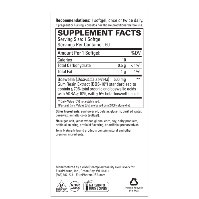 • Contains 500 mg of concentrated Boswellia per softgel