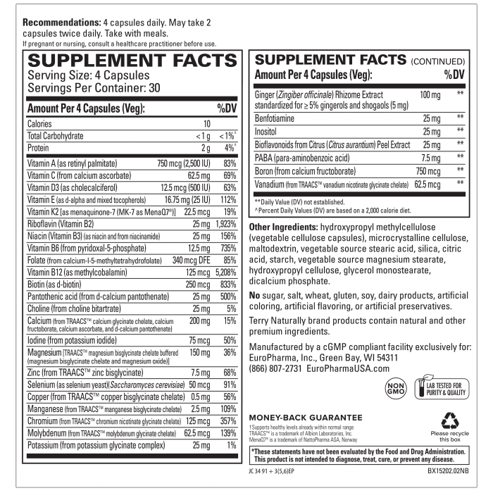 Terry Naturally Clinical Essentials features bioavailable forms of key nutrients, including methylated B vitamins for energy, chelated minerals for absorption, and antioxidants like vitamins C and E for protection against oxidative stress. Furthermore, it includes trace minerals such as zinc, selenium, and chromium to promote metabolic balance and immune function.