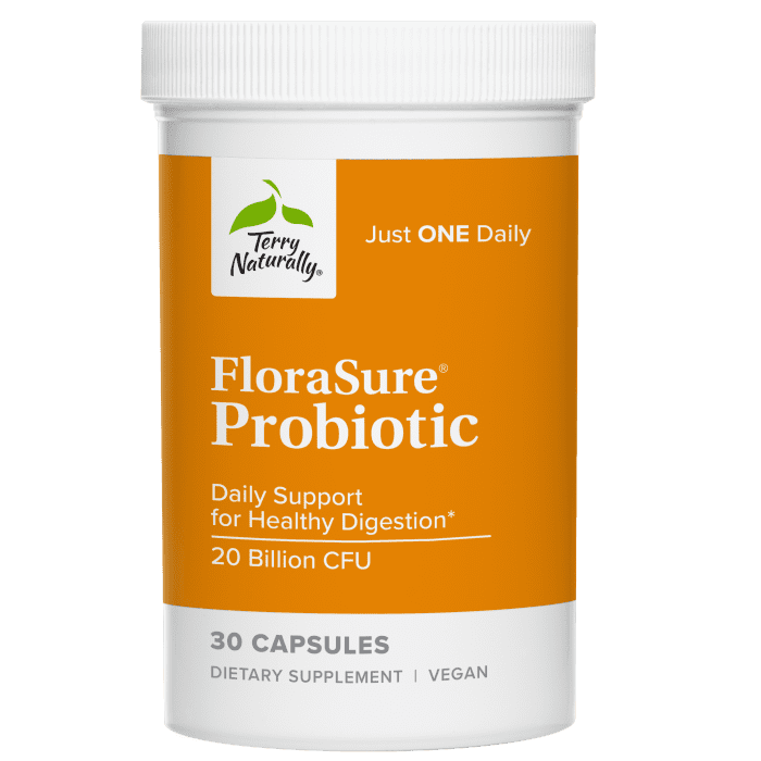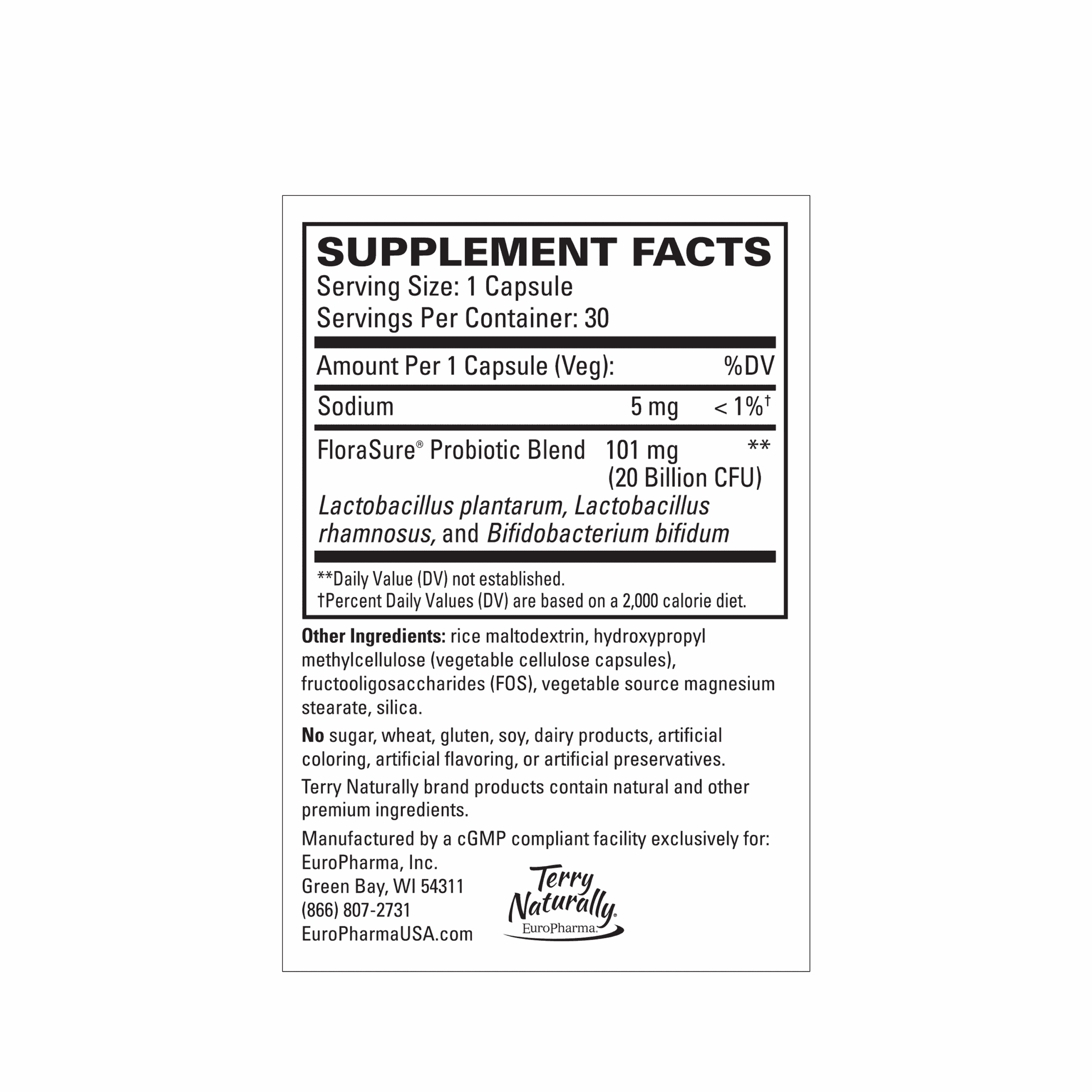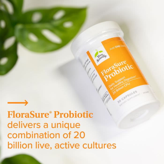 Terry Naturally FloraSure Probiotic delivers 20 billion CFU of beneficial bacteria to support balanced digestion, gut comfort, and daily immune health.