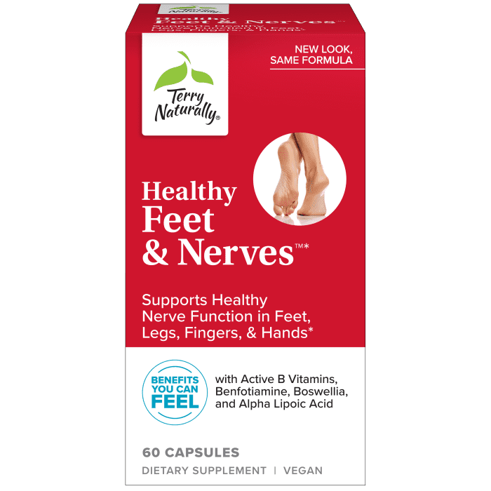 Terry Naturally Healthy Feet & Nerves supports nerve health, circulation, and comfort with benfotiamine and B vitamins for lasting balance and mobility.