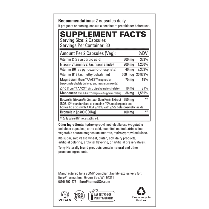 This advanced formula features Boswellia BOS-10® to support comfort and mobility, along with bromelain and vitamin C to promote natural collagen synthesis. In addition, niacinamide and active B-vitamins help maintain muscle and nerve function, while magnesium, zinc, and manganese contribute to tissue resilience. Furthermore, every batch is produced in a cGMP facility, ensuring purity, potency, and consistent quality.