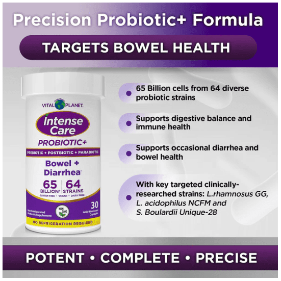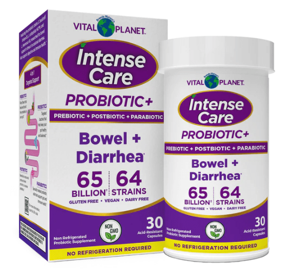 Vital Planet Intense Care Bowel + Diarrhea helps relieve occasional diarrhea and supports healthy bowel balance with a gentle, shelf-stable probiotic formula.