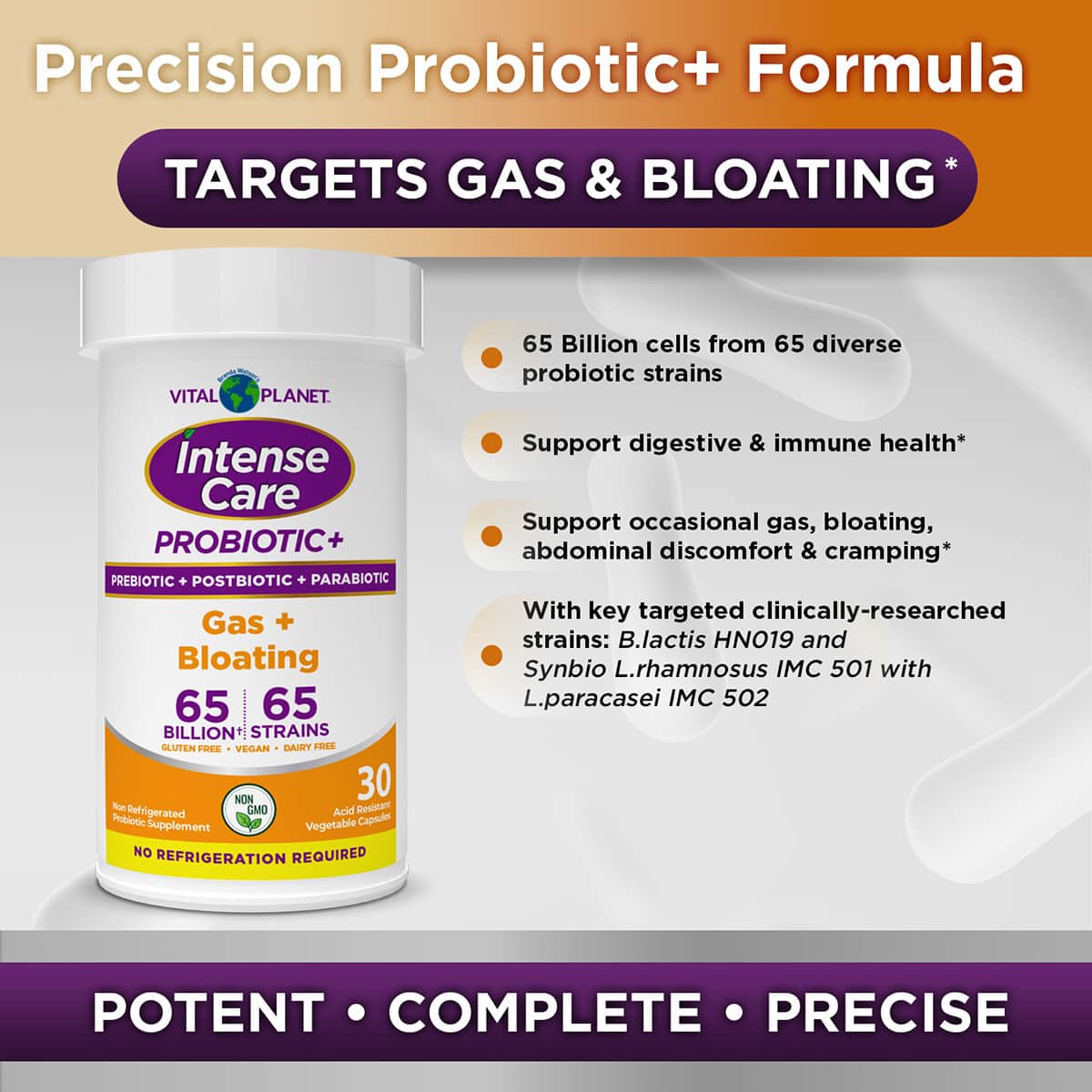 Vital Planet Intense Care Gas + Bloating helps relieve digestive discomfort with probiotics that support gut balance, reduce bloating, and promote smooth, healthy digestion—no refrigeration needed.