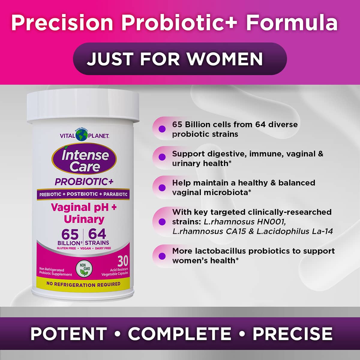 Vital Planet Intense Care Vaginal + Urinary supports feminine balance and comfort with targeted probiotics for healthy flora, pH levels, and urinary tract wellness. The shelf-stable formula provides daily, reliable care without refrigeration