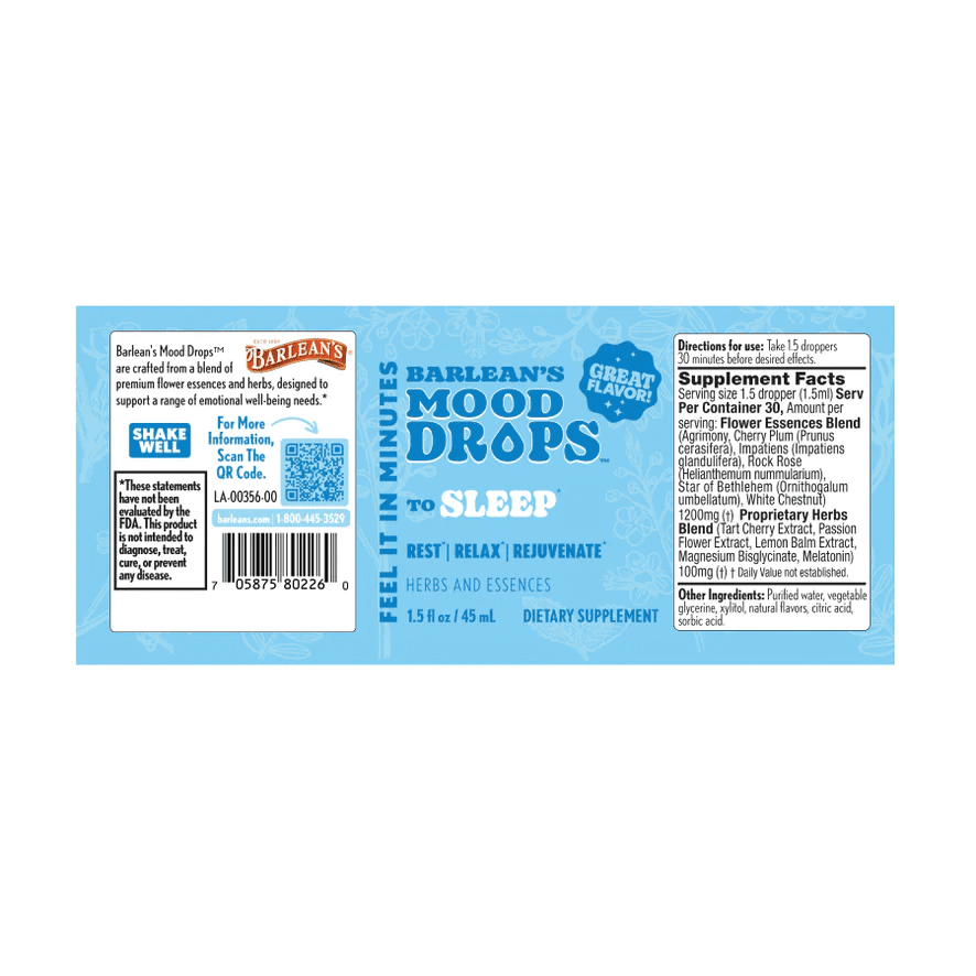 Barlean’s Mood Drops – Sleep offers gentle, natural support to calm the mind and encourage deep, restorative rest. This herbal blend combines time-honored ingredients like valerian root, passionflower, and chamomile to quiet the body’s stress response and promote relaxation before bedtime.