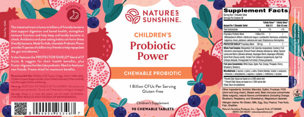 Nature’s Sunshine Probiotic Power – 90 Chewables supports digestive health and immune balance through a blend of beneficial probiotics. Each chewable tablet provides friendly bacteria that help maintain gut flora, support nutrient absorption, and promote overall digestive comfort. This great-tasting, natural formula makes it easy for the whole family to enjoy daily gut support.