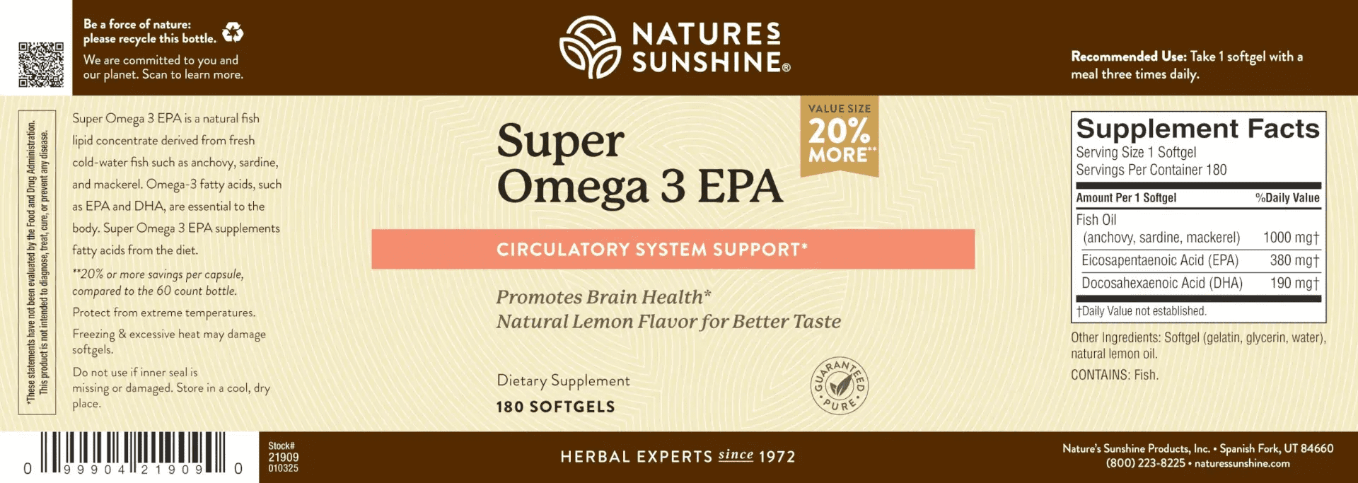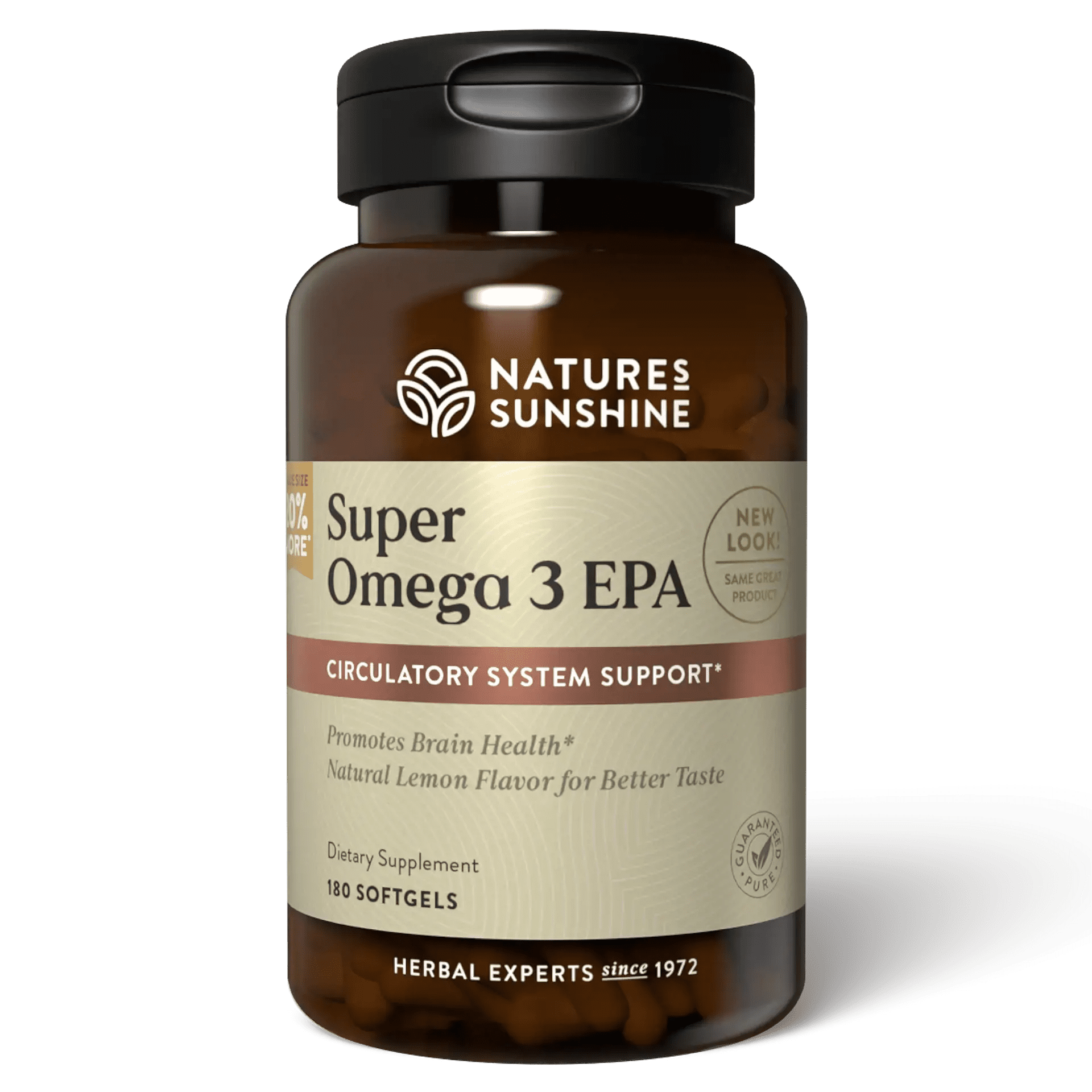 Nature’s Sunshine Super Omega-3 EPA (180 Softgel Caps) provides concentrated, high-quality omega-3 fatty acids to support heart, brain, and joint health. Each softgel delivers EPA and DHA from pure, sustainably sourced fish oil to help maintain cardiovascular wellness, support healthy brain function, and promote a balanced inflammatory response. With natural lemon flavor to reduce fishy aftertaste, it’s an easy addition to your daily wellness routine.