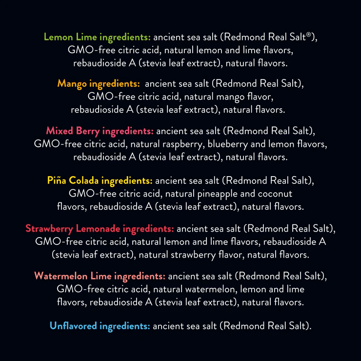 Re-Lyte Hydration Stick Pack – 30 ct – Variety delivers clean hydration in a fun, flavorful way. Each pack contains a mix of natural electrolyte blends made with Redmond’s Real Salt and essential minerals. This combination helps your body maintain energy, balance, and performance throughout the day.