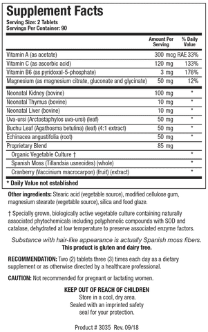 In addition, it features a synergistic combination of vitamin A, vitamin C, vitamin B6, and magnesium along with herbal ingredients such as uva ursi, buchu leaf, echinacea root, and cranberry extract. These botanicals have been traditionally used to support urinary comfort and microbial balance. Moreover, the inclusion of neonatal glandular extracts from kidney, thymus, and liver tissues provides targeted support for organ health and filtration efficiency.