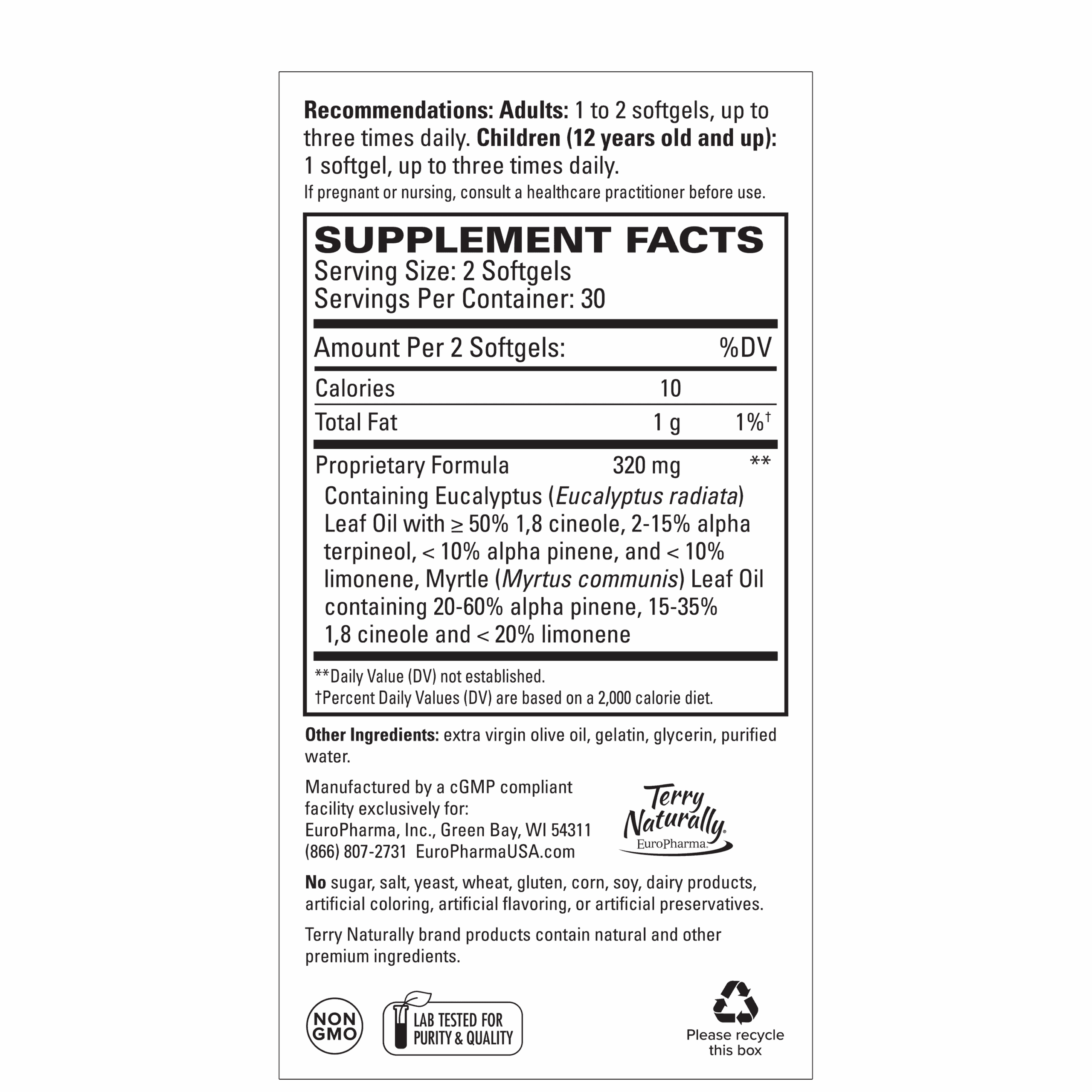 Terry Naturally SinuCare provides gentle yet effective support for healthy sinus, bronchial, and respiratory function. Each capsule delivers a balanced blend of eucalyptus, myrtle, lemon, and rosemary oils to promote open airways, clear breathing, and overall respiratory comfort. This non-drowsy formula helps maintain sinus drainage and supports year-round breathing ease without harsh stimulants or synthetic additives.