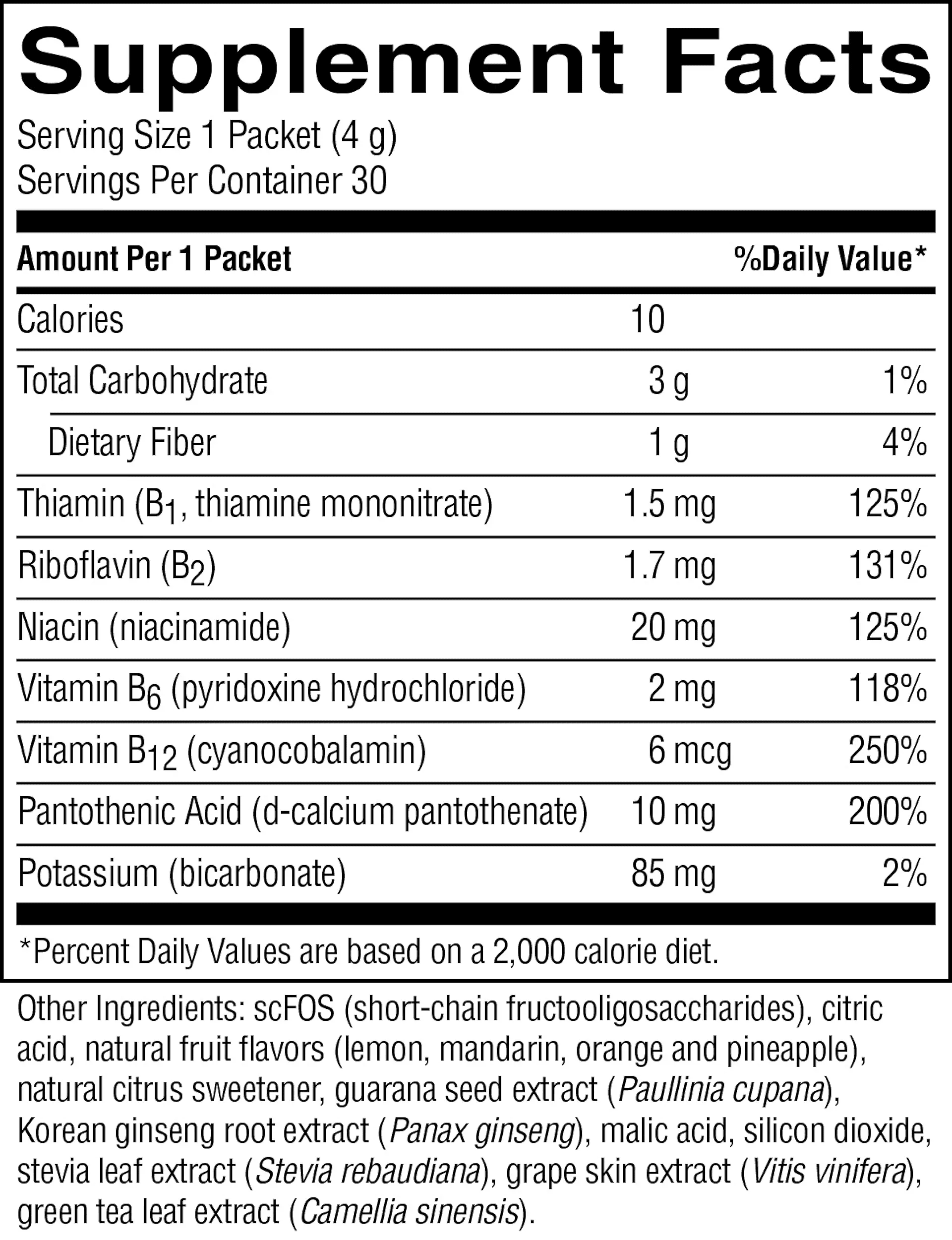 Daily energy support supplement in convenient packets with vitamins, minerals, and herbal extracts to promote natural energy, mental focus, and overall vitality.