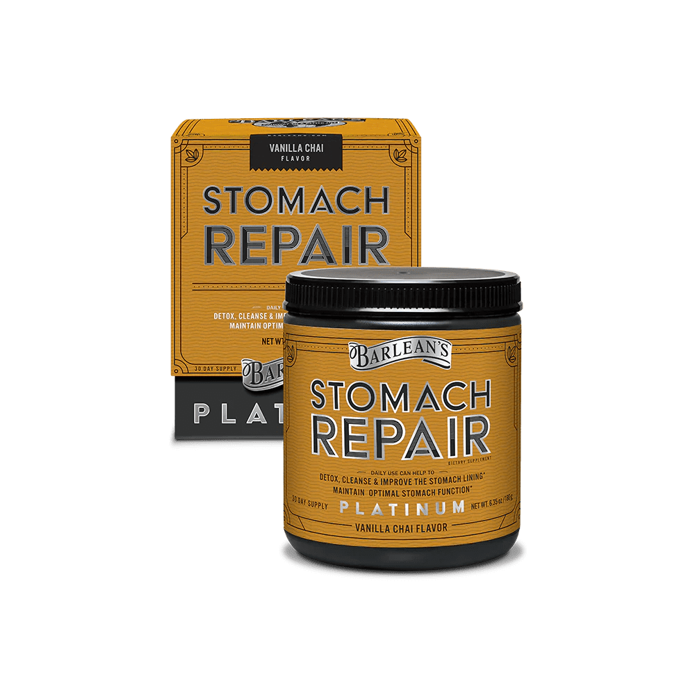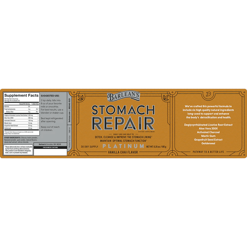 Support your digestive health with Barleans Stomach Repair Vanilla Chai, featuring natural ingredients to soothe and maintain stomach lining integrity.