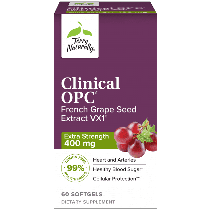 Terry Naturally Clinical OPC Extra Strength 400 mg – 60 Softgels promotes heart, brain, and immune health. Features French grape seed extract for high-absorption antioxidant support.