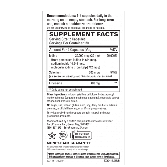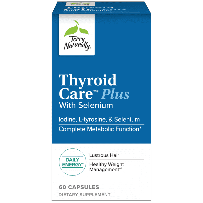Terry Naturally Thyroid Care Plus supports thyroid function and metabolism with iodine, L-tyrosine, selenium, and ashwagandha. This balanced formula promotes steady energy and overall vitality.