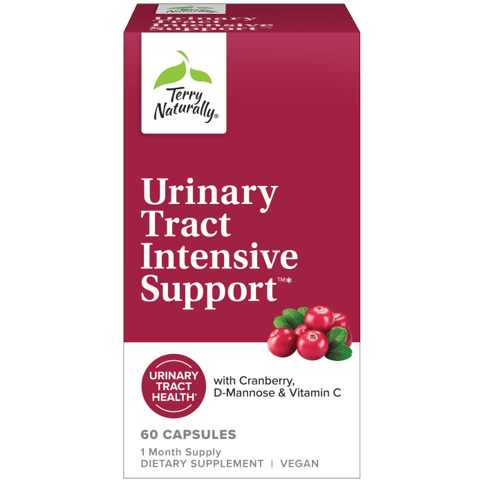 Terry Naturally Urinary Tract Intensive Support promotes bladder comfort and urinary health with hibiscus and cranberry extracts that support balance and natural cleansing.
